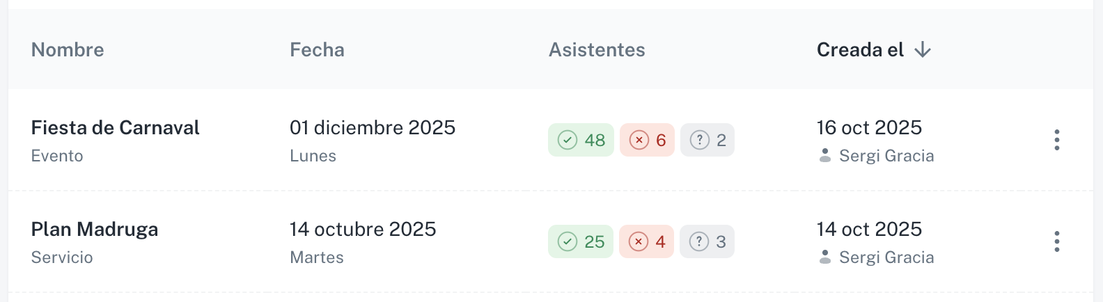 Una vez creado, el listado aparecerá en la tabla de listados de Asistencia, donde podrás acceder a él, buscarlo o filtrarlo por nombre o fecha.