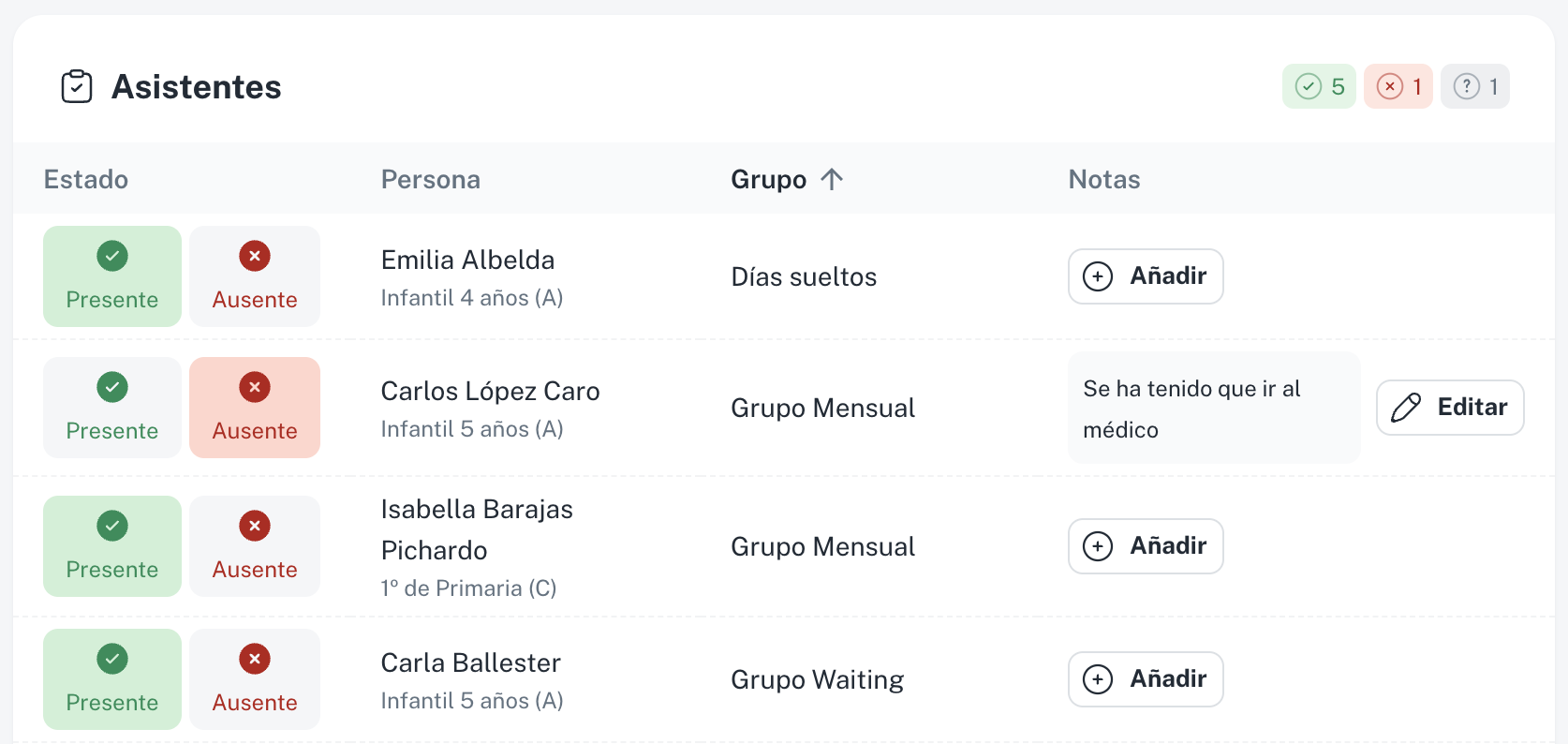 Son especialmente útiles para que los monitores o administradores registren quién ha asistido a una actividad en una fecha concreta y así "pasar lista".