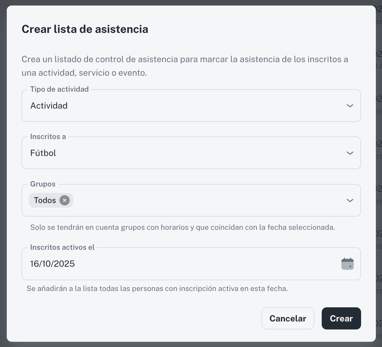 Solo se añadirán a la lista las personas inscritas en grupos que tengan horarios y estos coincidan con la fecha seleccionada. (ej. inscritos a un grupo que funciona los lunes).