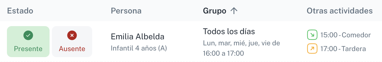 Cada día, el monitor puede crear un listado de asistencia para la fecha actual y marcar quién ha venido al comedor. Esto puede incluir tanto personas inscritas mensualmente como contrataciones de días sueltos.