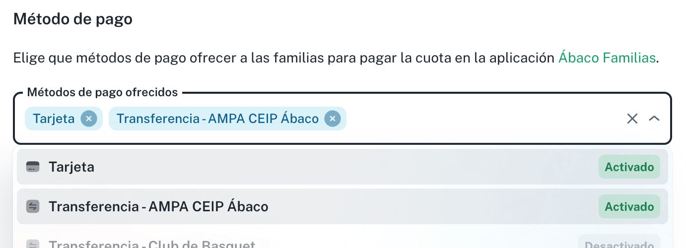Selecciona uno o varios métodos de pago que se ofrecerán a las familias para pagar la cuota.