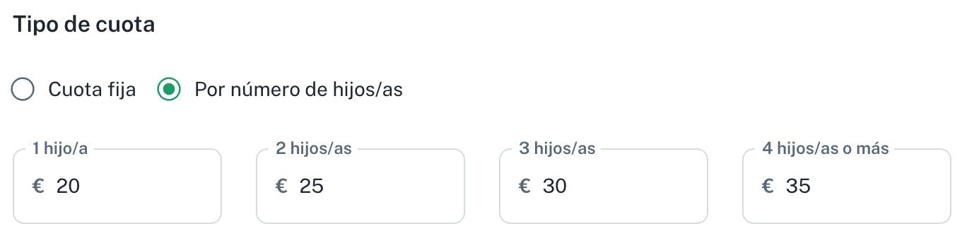 Cuota por número de hijos: define un precio distinto según el número de hijos (1, 2, 3 o 4 o más).