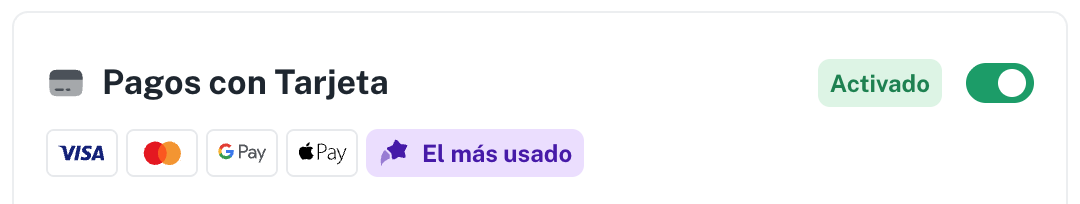 - En la sección Pagos con tarjeta, activa el interruptor (switch) si quieres ofrecer este método de pago.