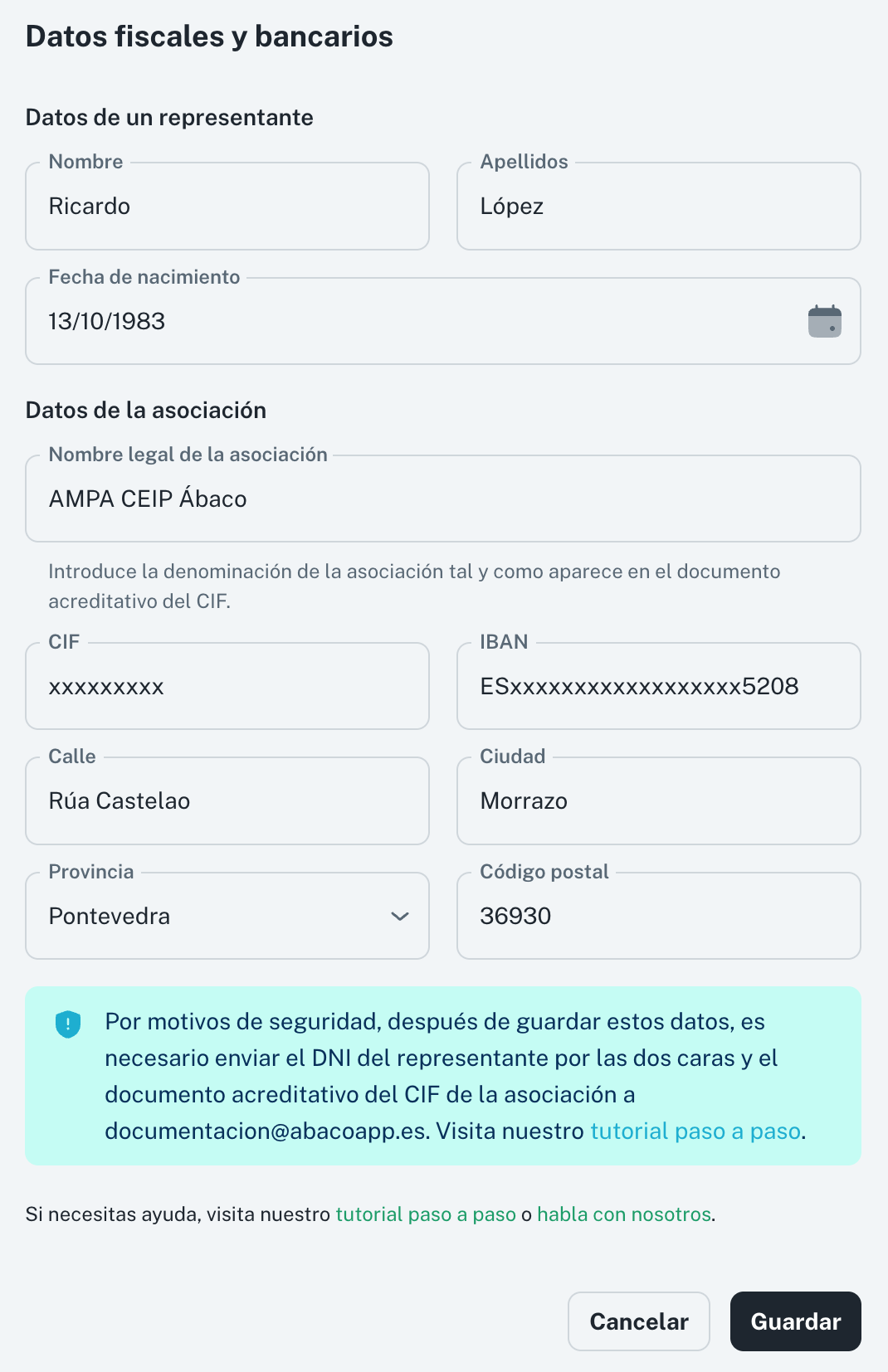 Para poder recibir el dinero de los pagos con tarjeta, es necesario completar la información fiscal y bancaria de la asociación.