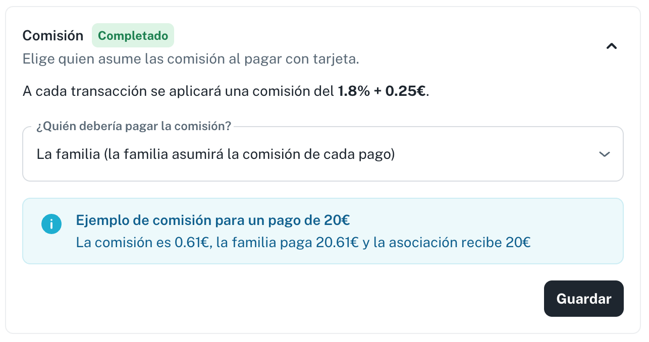 - Ejemplo: si el pago es de 20€ y la comisión de 0,61€, la familia pagará 20€ y recibirás 19,39€.