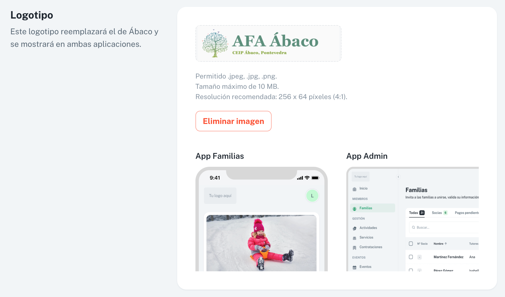 Desde esta sección podrás personalizar la identidad visual de tu AMPA o AFA dentro de Ábaco.