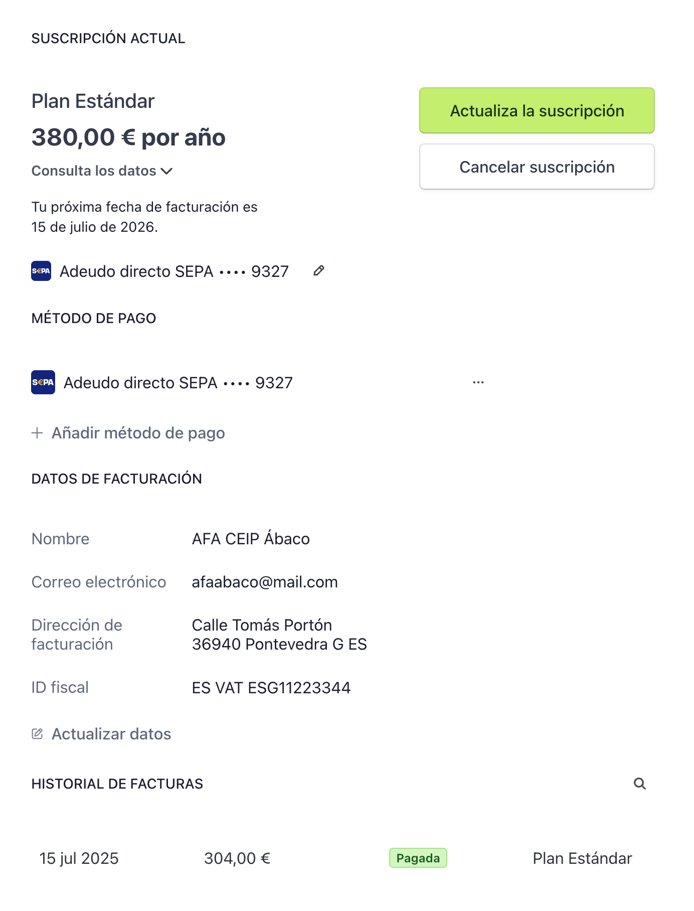 Con esta sección podrás gestionar fácilmente la suscripción y los pagos de tu asociación, controlar tus límites de uso y mantener tu facturación actualizada desde un único lugar.