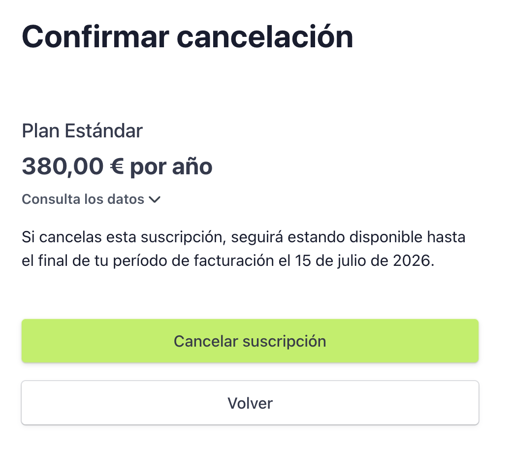 Puedes cancelar tu plan en cualquier momento desde el portal de facturación.