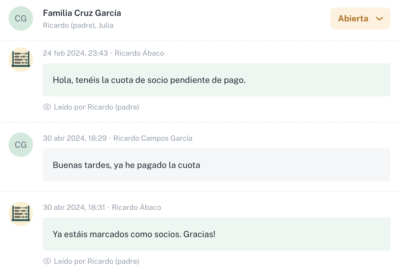 En la misma vista podrás leer todos los mensajes intercambiados con la familia, ordenados cronológicamente.