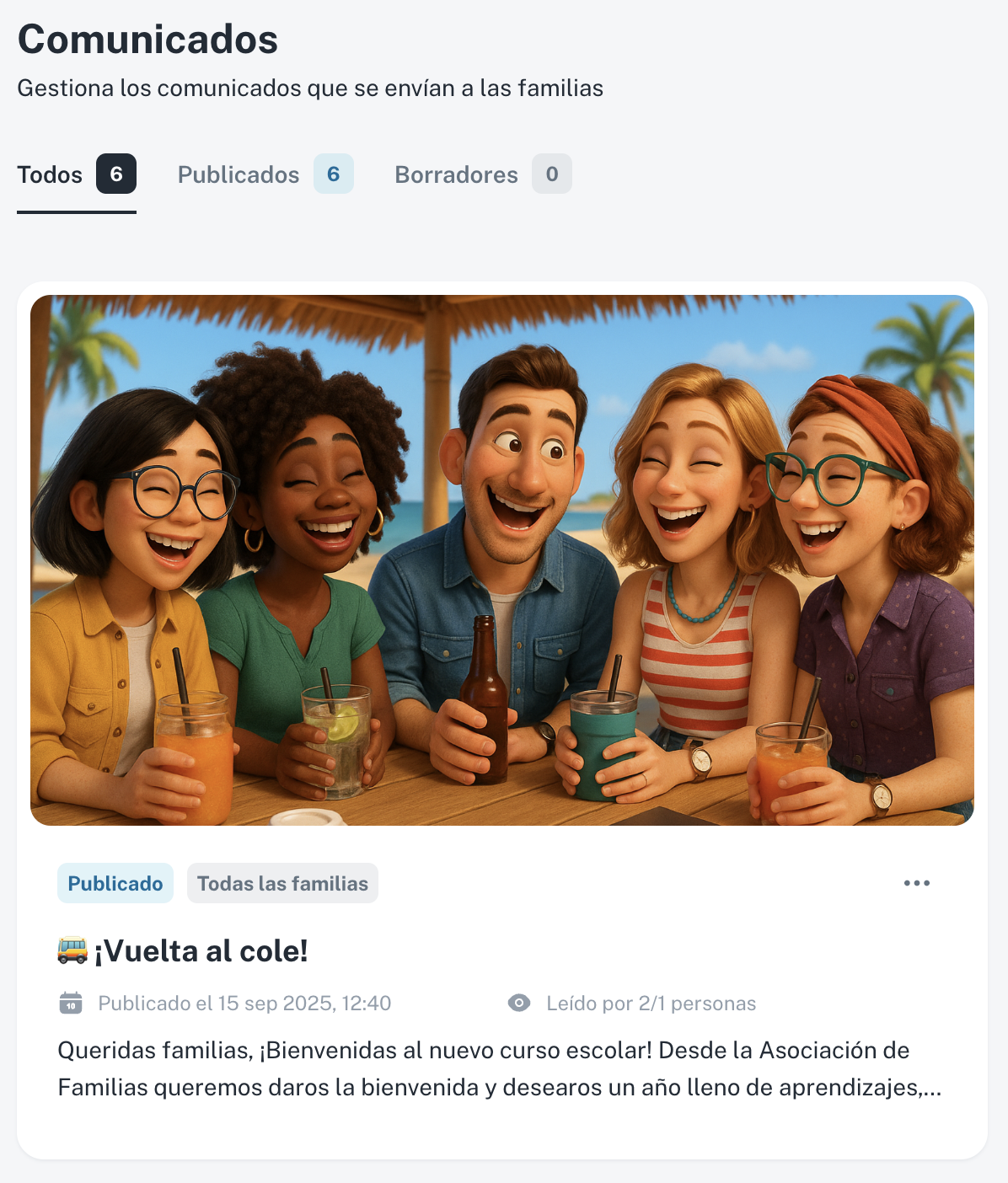 Consulta y organiza todos los comunicados que has enviado desde tu asociación. Desde esta pantalla puedes revisar los mensajes anteriores, ver cuántas familias los han leído o continuar editando los que aún están en borrador.