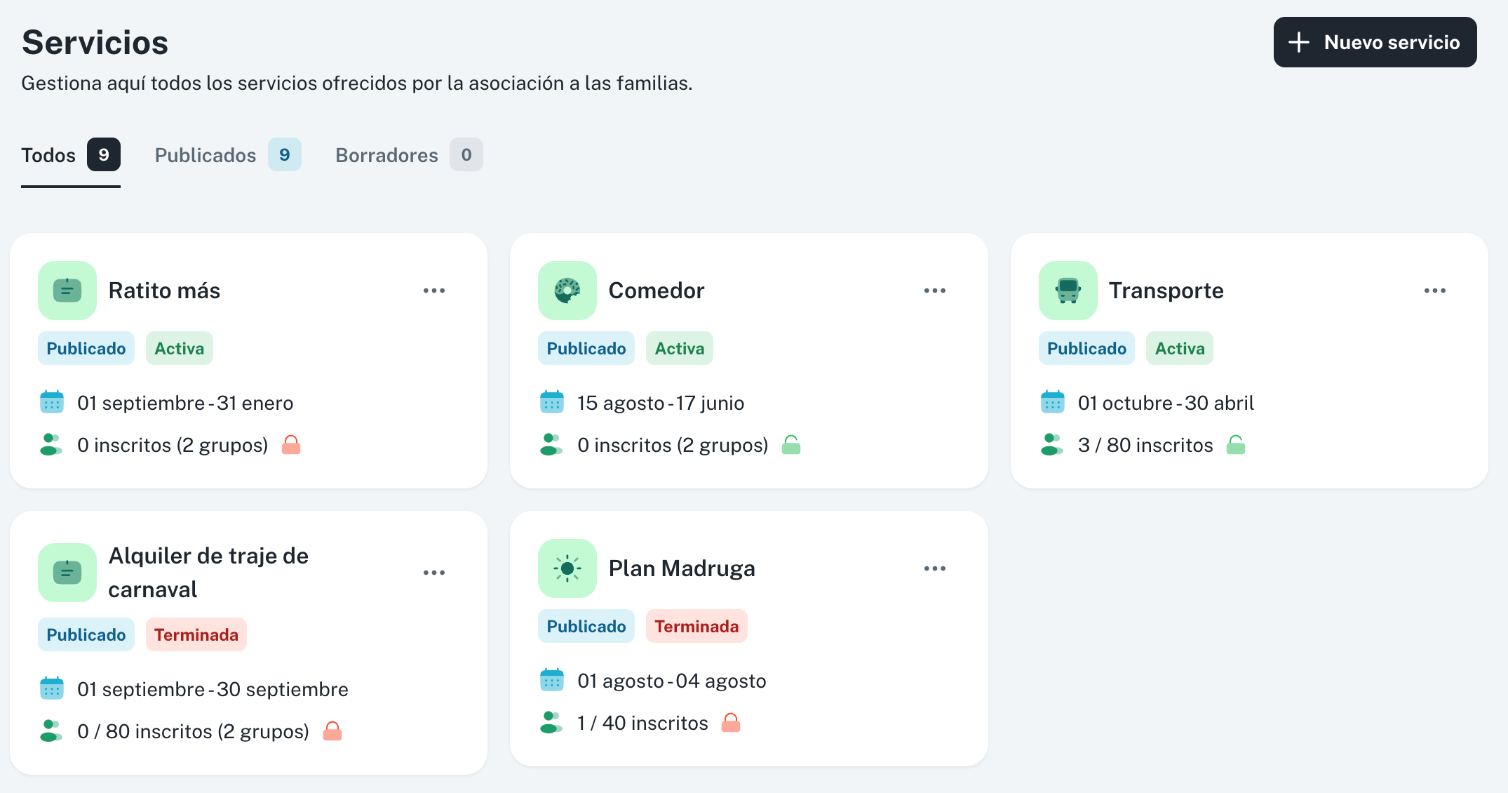 Verás una colección de tarjetas, donde cada tarjeta representa un servicio que has creado para tu AMPA. Los servicios se agrupan por curso escolar, empezando por el curso actual o el más reciente.