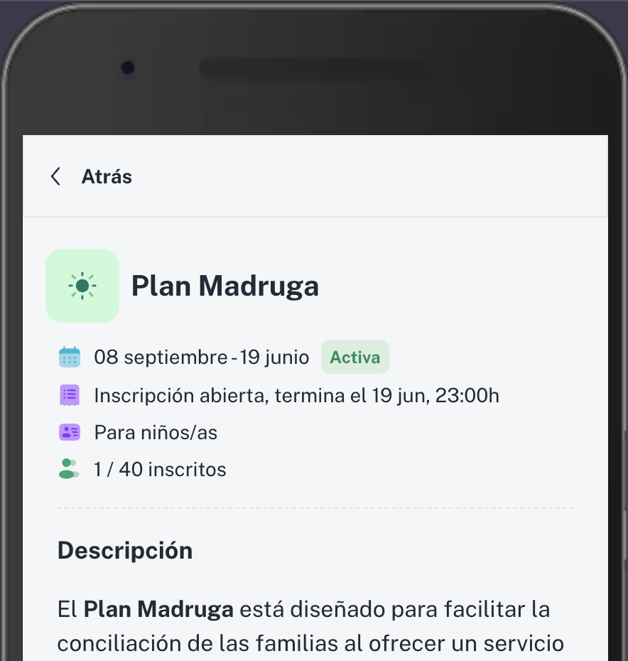 💡 El resto de campos — título, descripción, fechas, inscripción, grupos, precios, políticas y notificaciones — funcionan exactamente igual que en las extraescolares.