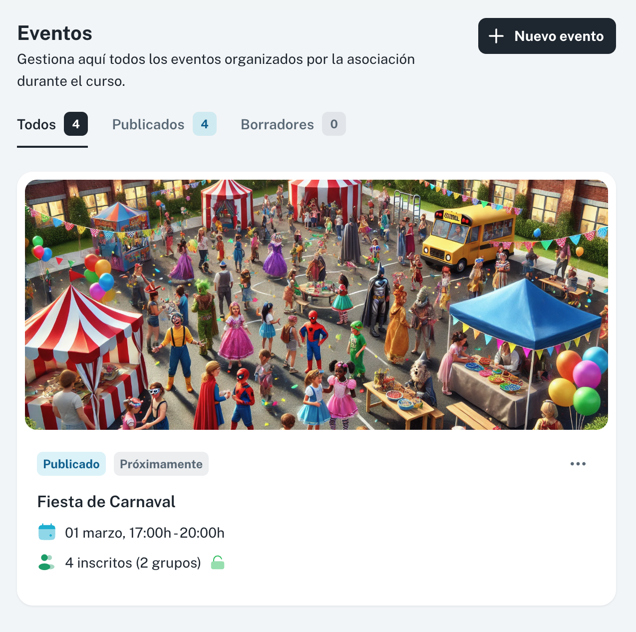 Desde este apartado podrás consultar, crear y gestionar todos los eventos organizados por tu AMPA o AFA, como fiestas, asambleas, talleres o celebraciones especiales.