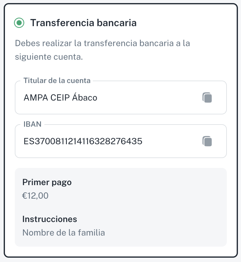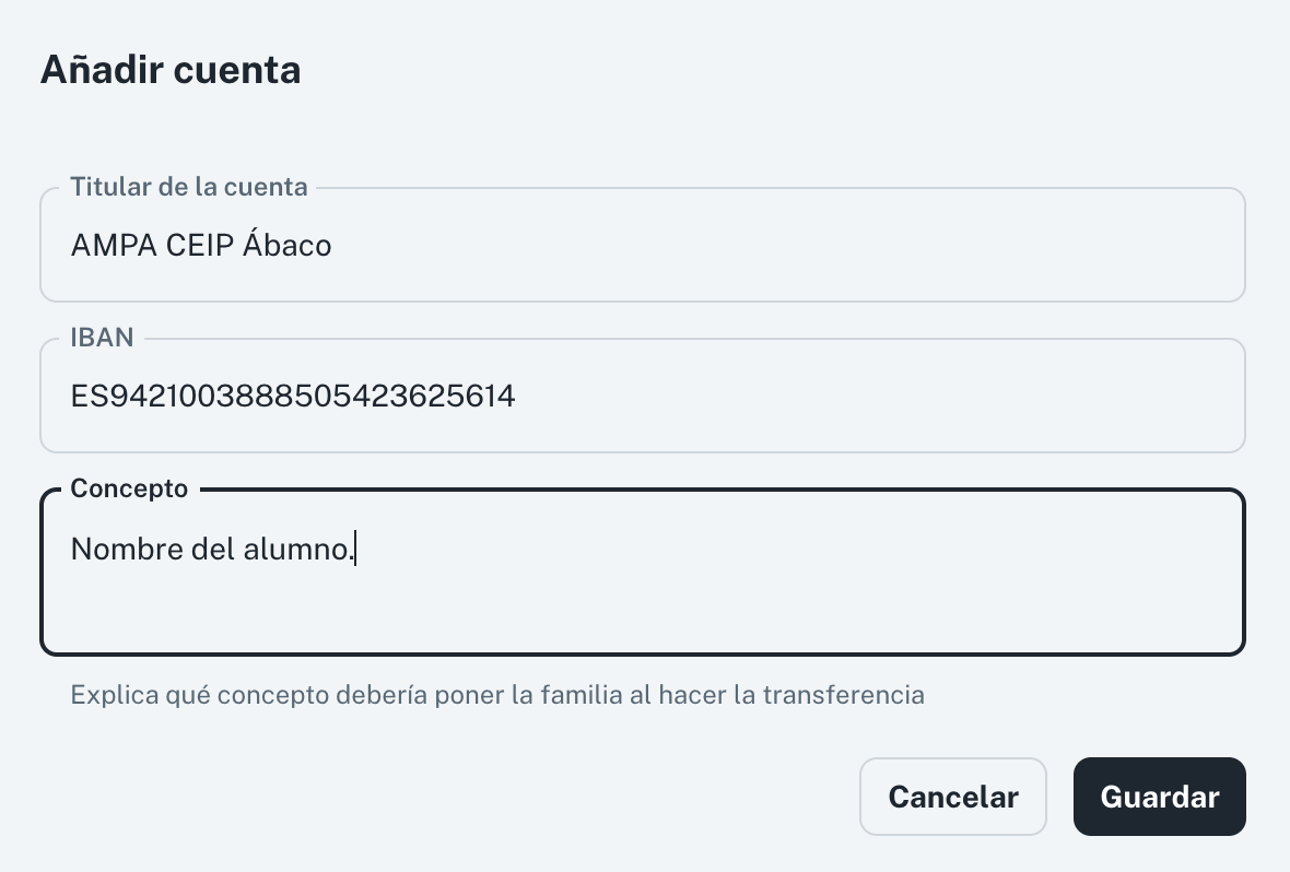 - Instrucciones para la familia: texto que verán las familias, normalmente indicando qué concepto deben escribir al hacer la transferencia.