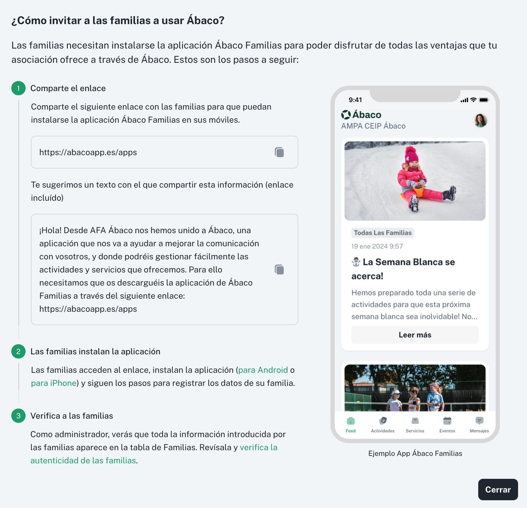 Al hacer clic en Invitar familias, se abrirá un diálogo con los pasos recomendados para que las familias creen su cuenta desde la aplicación Ábaco Familias.