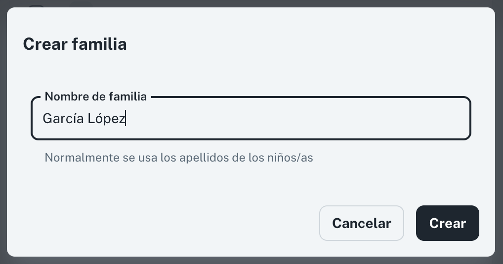 Al escribir el nombre y pulsar Crear, se generará automáticamente la familia y accederás a su ficha detallada. Desde ahí podrás añadir tutores, alumnos o completar su información.