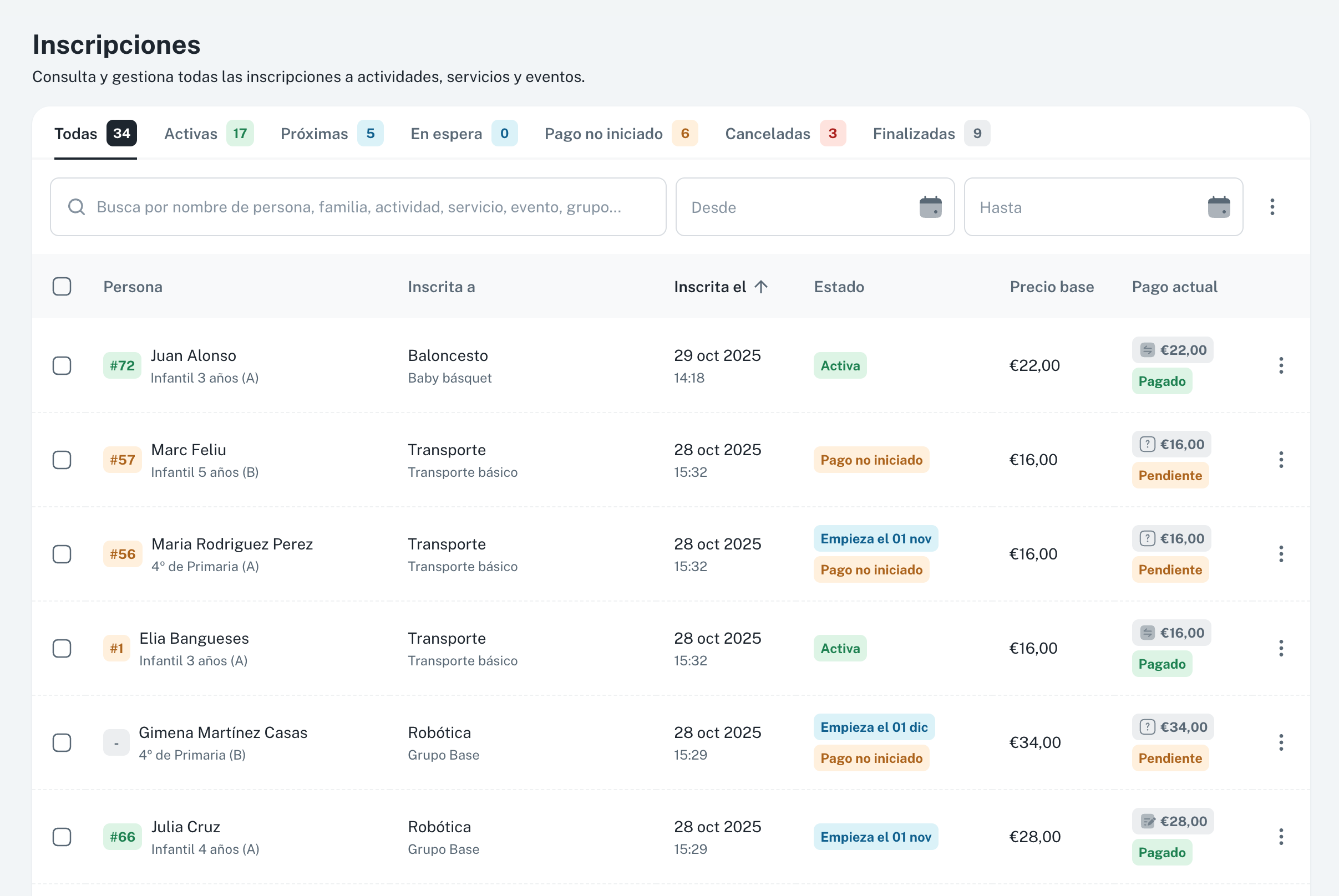 Puedes consultar o modificar los detalles de cualquier inscripción desde las tablas de inscripciones que aparecen en diferentes partes de la aplicación.