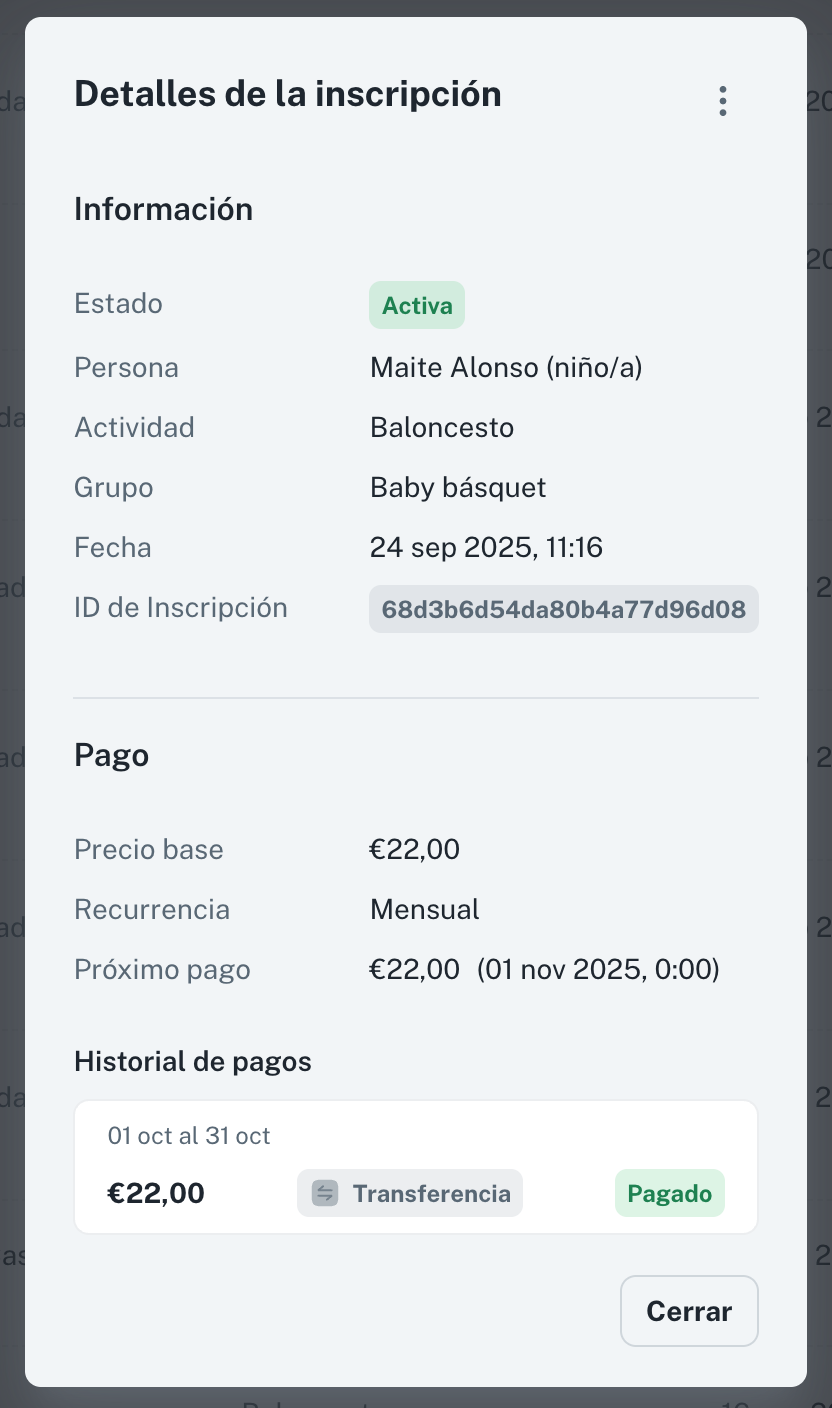 Desde aquí podrás revisar la información completa de cada participante, ver su historial de pagos o actualizar algunos campos básicos como el precio o los comentarios.