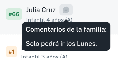Si una familia dejó un comentario al inscribirse, verás un pequeño icono de diálogo 💬 junto al nombre de la persona inscrita.
