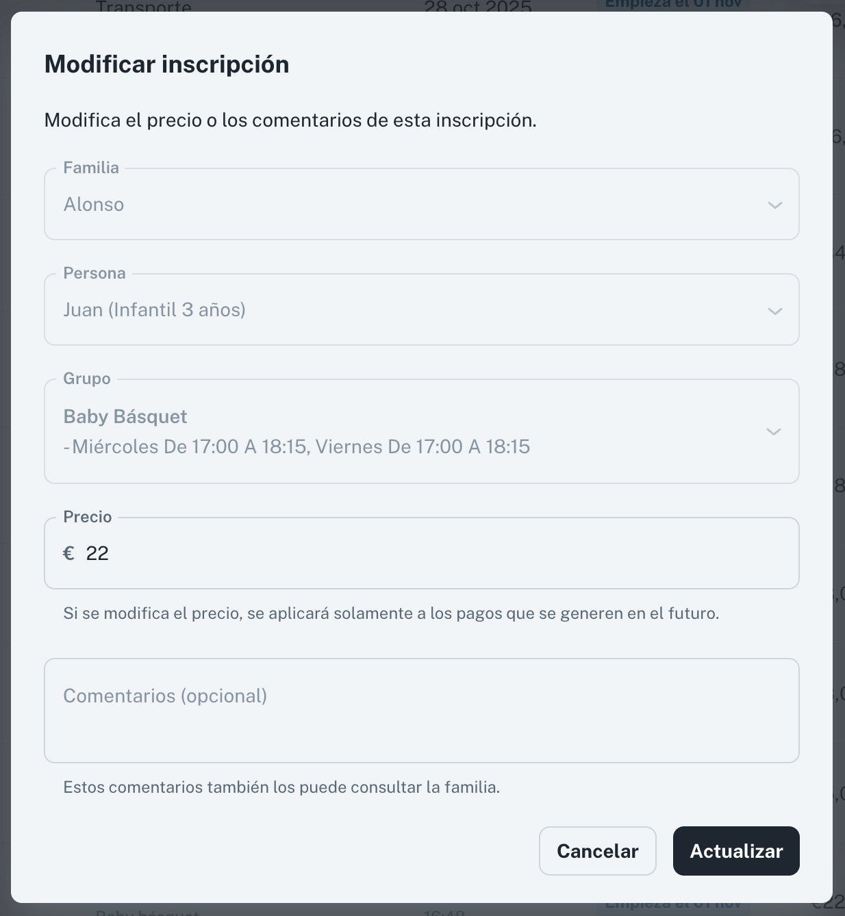 Define el precio de referencia de la inscripción. Si modificas este valor, todos los pagos futuros generados a partir de ese momento usarán el nuevo importe.