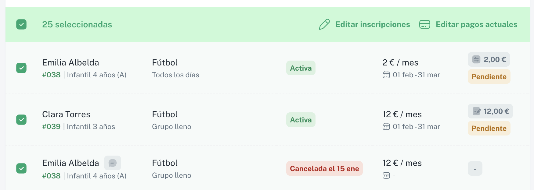 Si necesitas aplicar el mismo cambio a muchas inscripciones (por ejemplo, corregir el precio base de varias familias), puedes usar la edición múltiple.