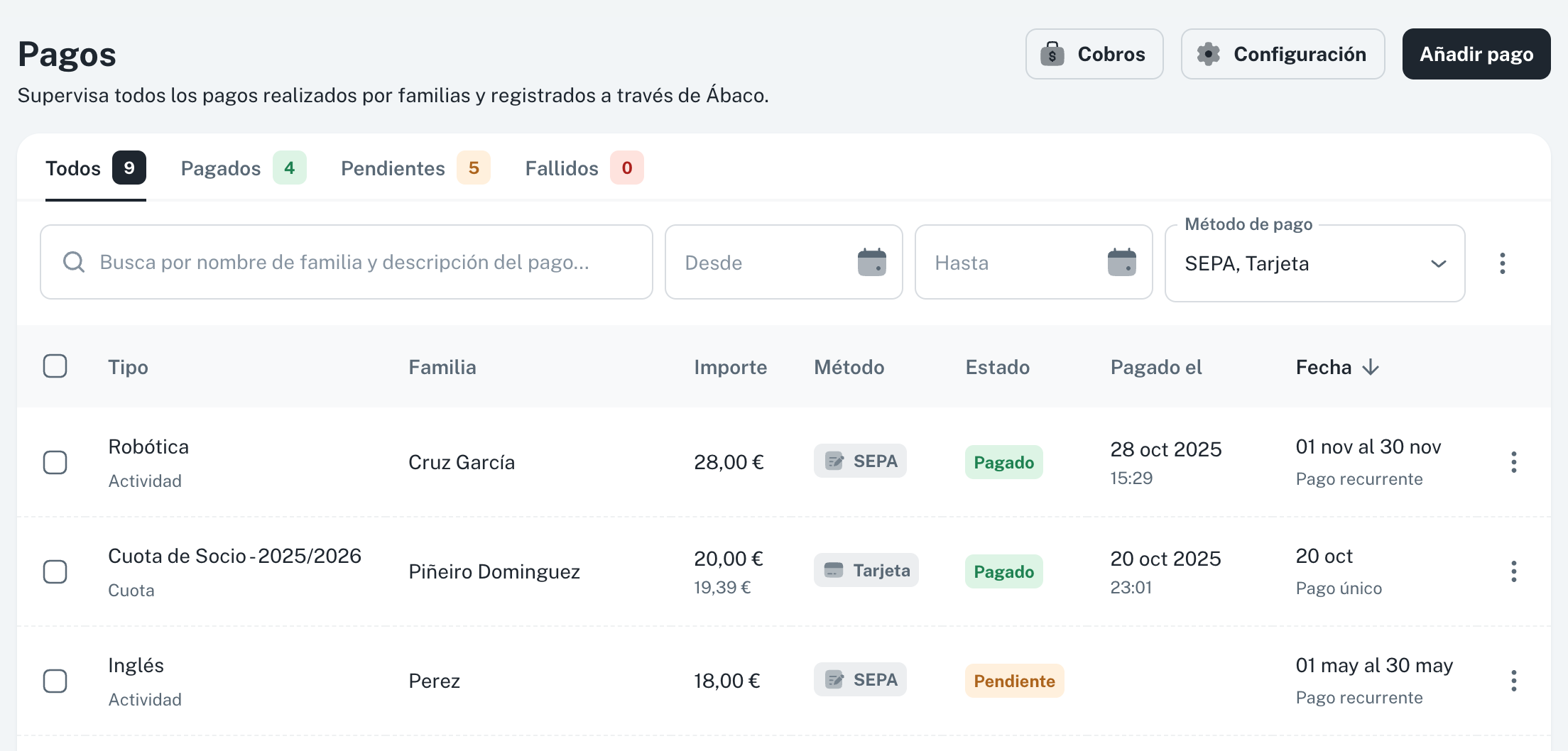 - En métodos de pago no automáticos (SEPA, transferencia, Bizum o efectivo), los pagos aparecen como Pendientes hasta que se marcan manualmente como pagados.