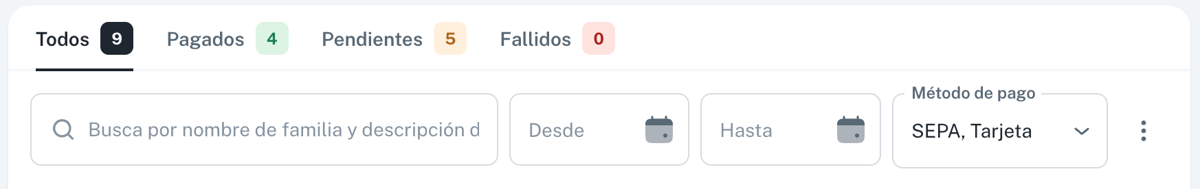 - Buscador por nombre de familia o descripción del pago (año de cuota, nombre de extraescolar...).