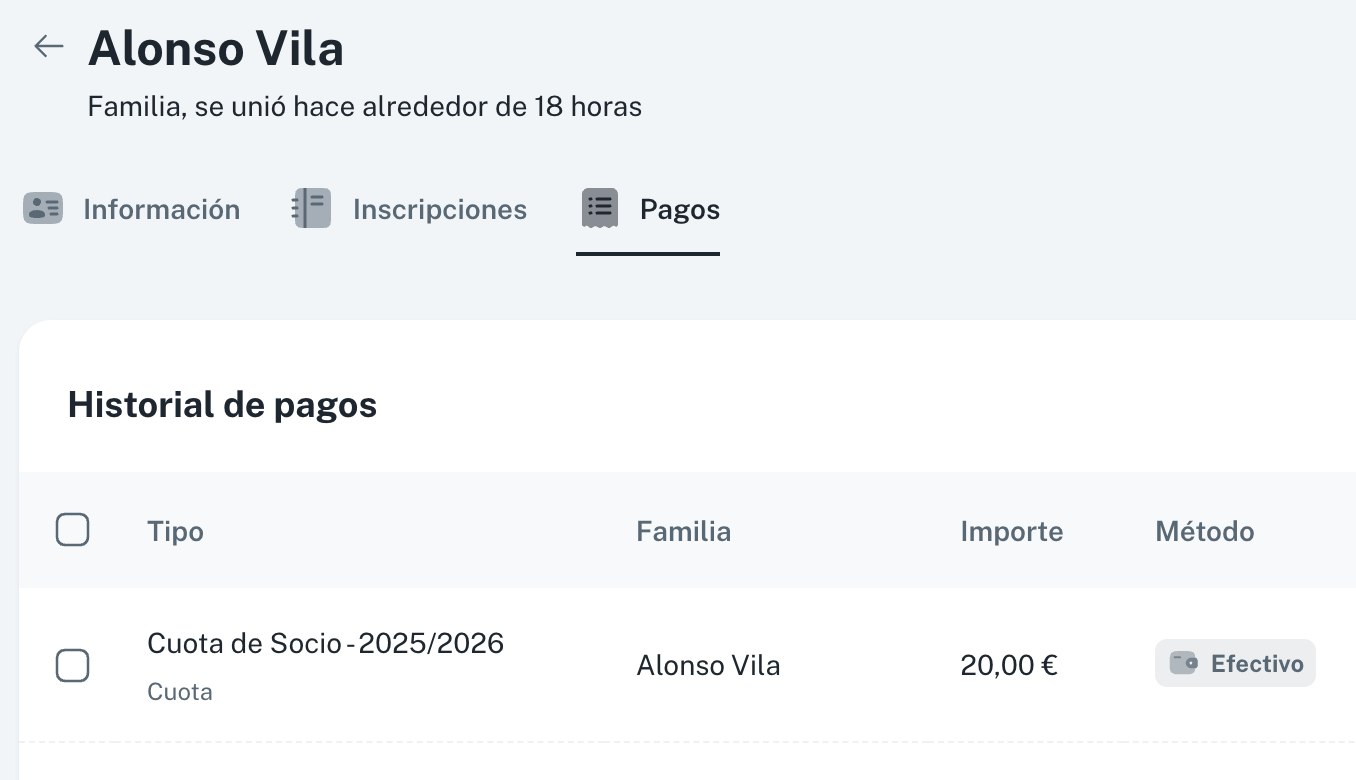 También puedes ver los pagos de una familia concreta desde su ficha individual.