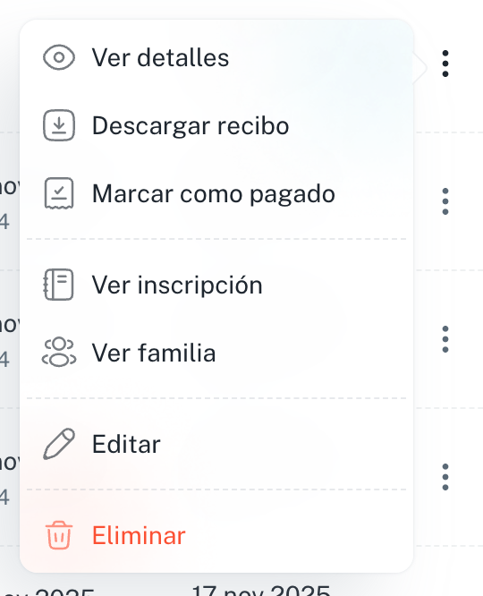 - Abrir el menú de acciones (tres puntos) para ver detalles, descargar recibo, editar, eliminar o marcar el pago como pendiente/pagado.
