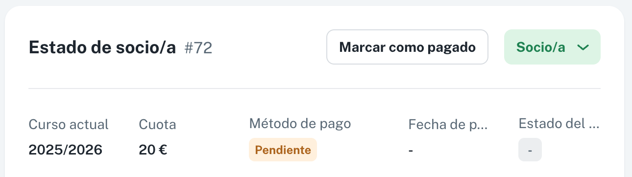 En el detalle de una familia, si la cuota tiene un método de pago no automático (SEPA, transferencia, Bizum o efectivo), verás un botón Marcar como pagado.
