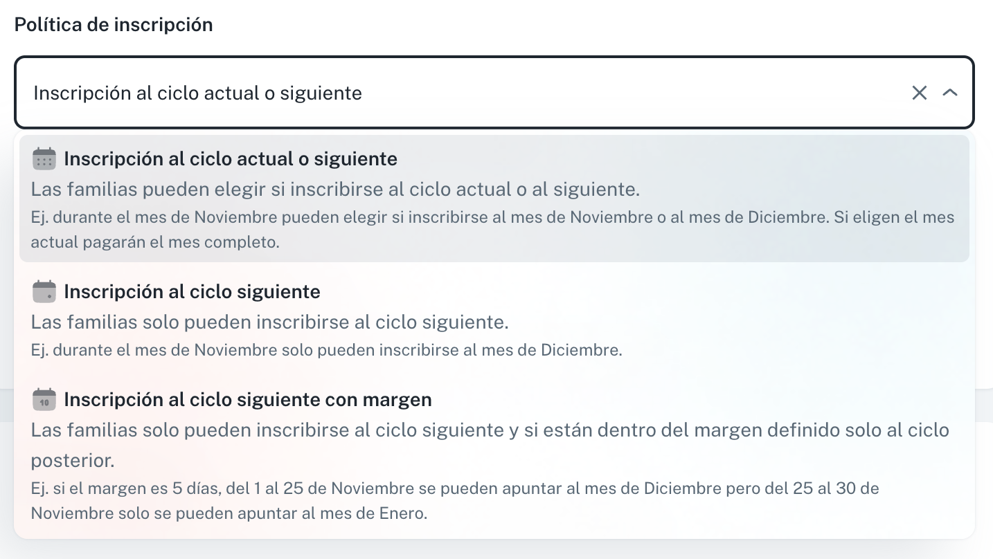 - Política de inscripción: al ciclo siguiente con margen de 5 días