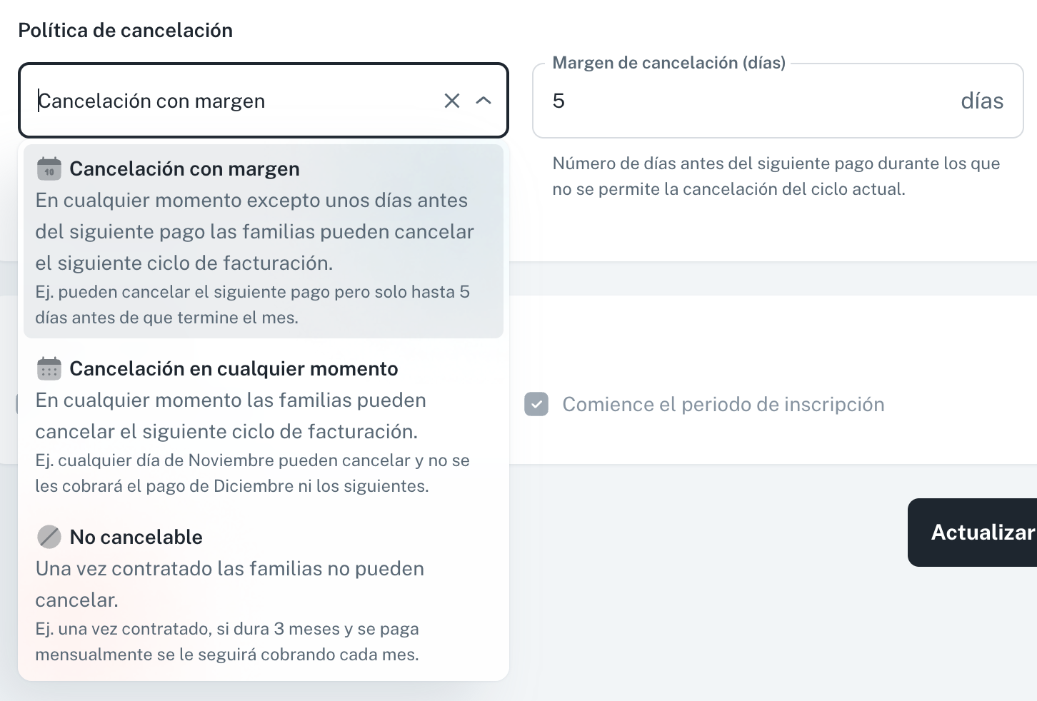 💡 Ejemplo: Una familia con política “cancelación con margen de 5 días” que se da de baja el 28 de octubre verá su inscripción activa hasta el 30 de noviembre, porque ya se superó el margen.