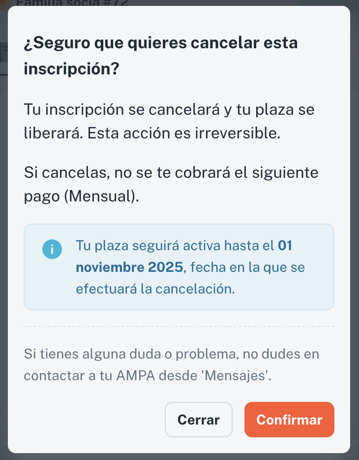 - Cuando una familia cancela, la app informa de la fecha efectiva de finalización.
