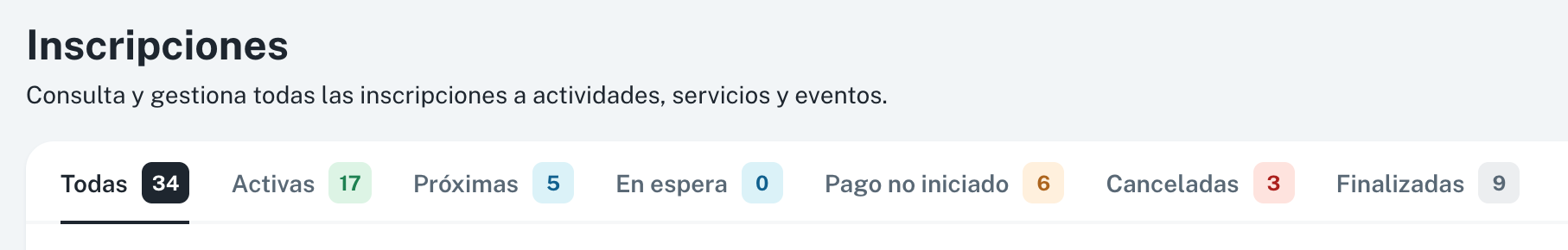 Desde el menú principal, ve a Inscripciones y utiliza las pestañas superiores para filtrar por estado.
