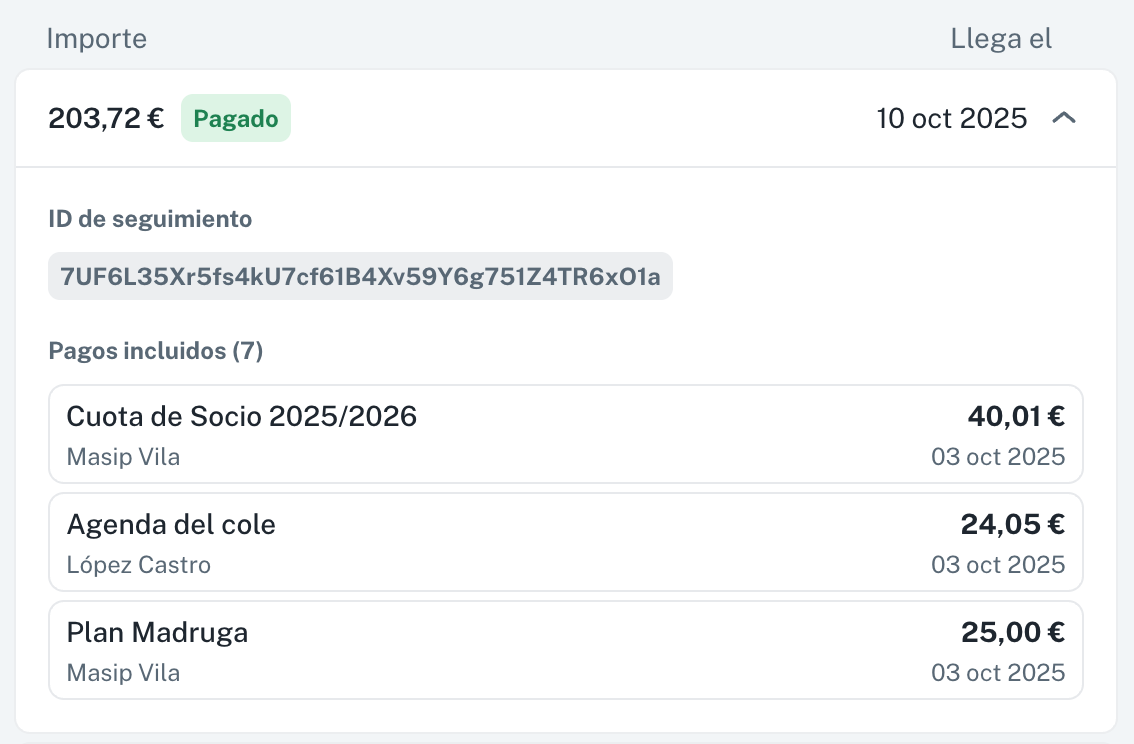 - Pagos incluidos: la lista de pagos individuales que componen esa transferencia.