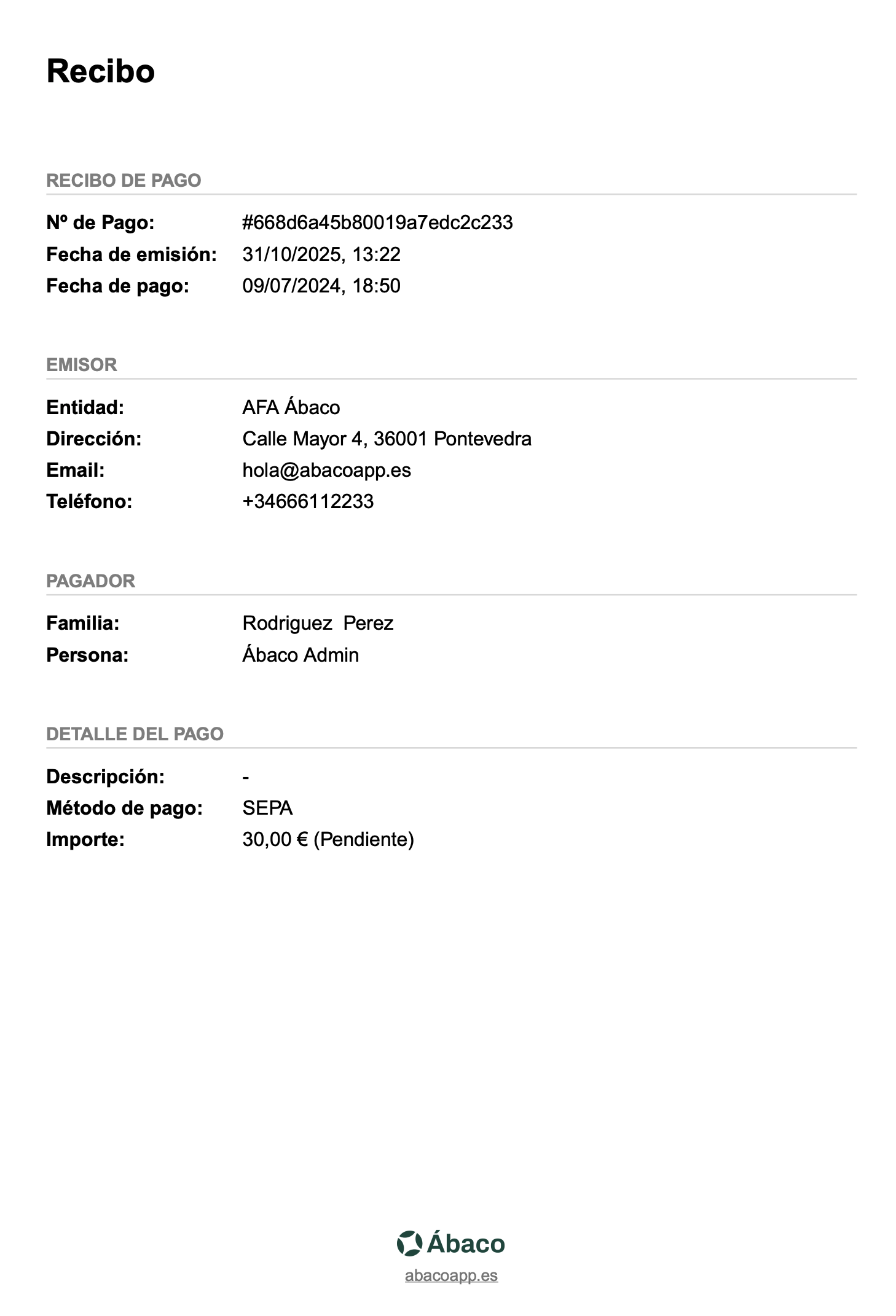El recibo se genera siempre en español y con diseño blanco y negro, incluyendo el logotipo de Ábaco en el pie de página.