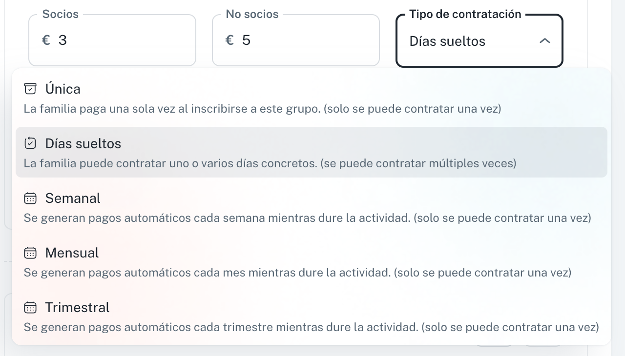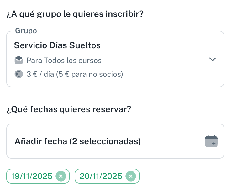 La funcionalidad de Días Sueltos (o días esporádicos) te permite ofrecer a las familias la opción de contratar uno o varios días concretos de un servicio o extraescolar, pagando solo por esos días. Es ideal para servicios como Madrugadores, Comedor, Tardes, etc.