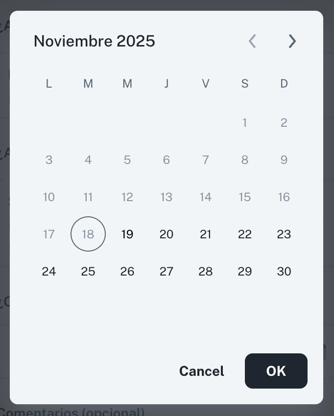 - Se muestra un calendario completo donde pueden elegir una o varias fechas.