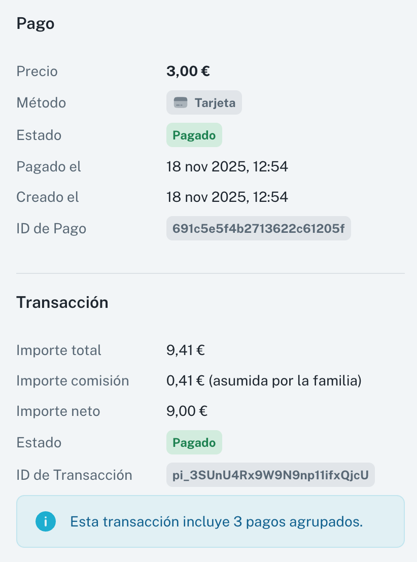 Aquí podemos ver un ejemplo de un pago de un "día suelto" que tenía como precio 3€ pero que cuando se contrató se contrató junto a otros 2 días sueltos (un total de 3 días sueltos). Sumados se pagaron 9€ en una transacción con tarjeta que además tenía una comisión asumida por la familia de 0,41€.