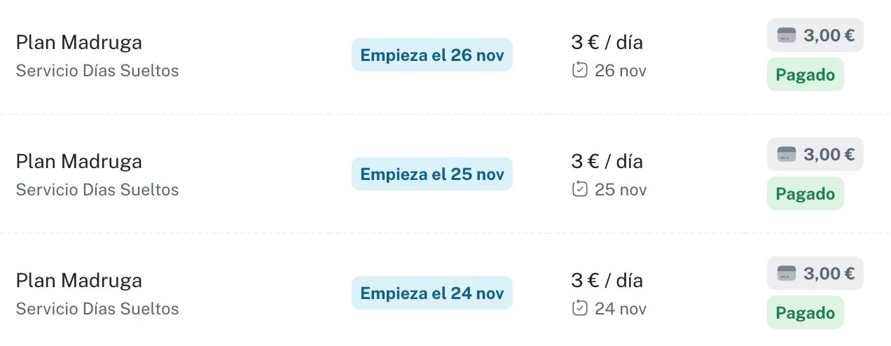 Las familias verán sus días contratados ordenados por fecha dentro de la actividad.