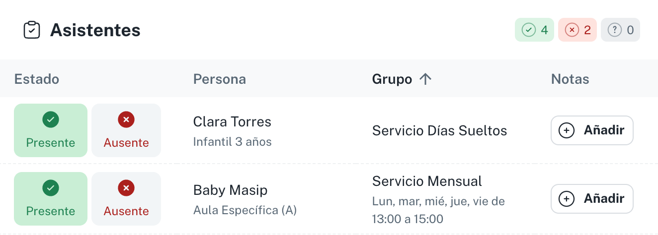- Puedes marcar presente o ausente exactamente igual que en cualquier otra inscripción.